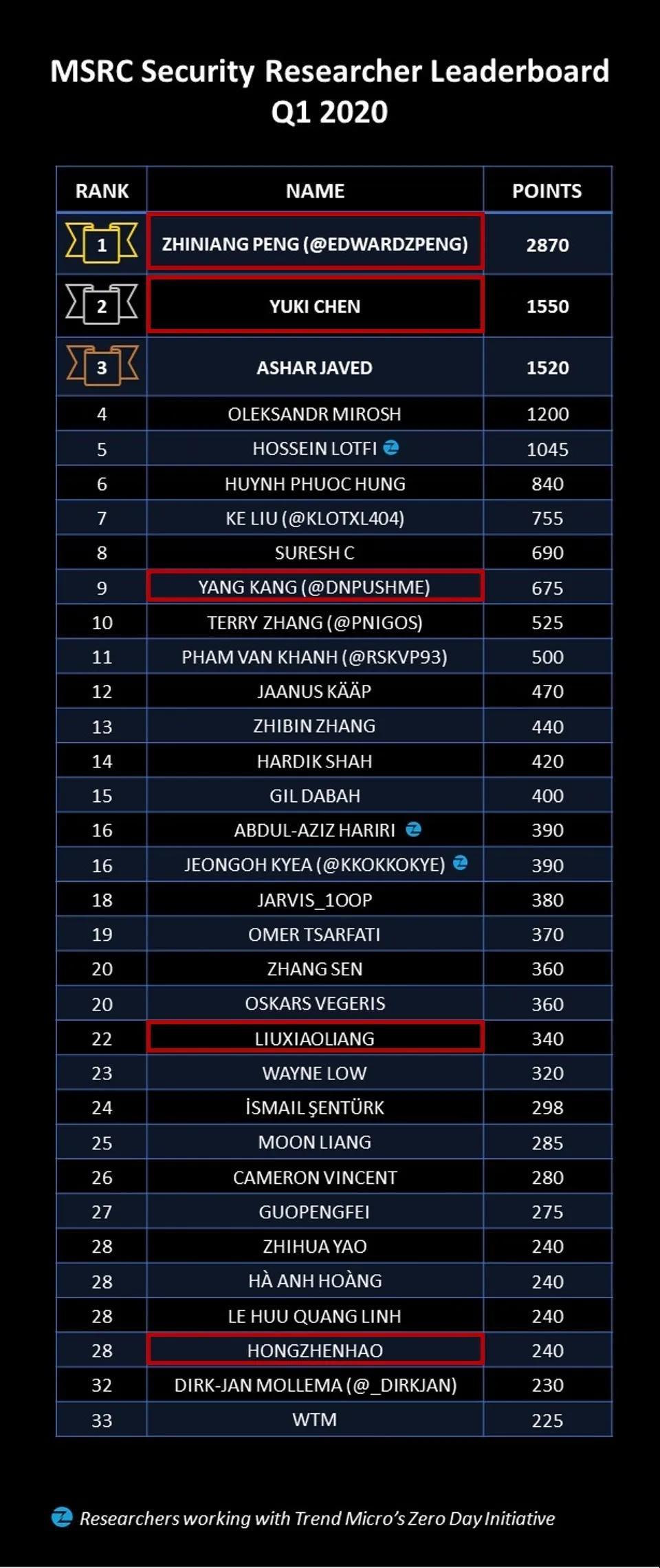 值得一提的是,来自360核心安全团队的彭峙酿(ZHINIANG PENG),不仅以2870分优异战绩雄踞Q1榜首,并且连续称霸MSRC两季度榜单,贡献势头丝毫不减;而古河(YUKI CHEN)则以1550分的成绩紧随其后,二者联手占据此次MSRC全球安全精英榜Q1榜单的冠、亚军之位。