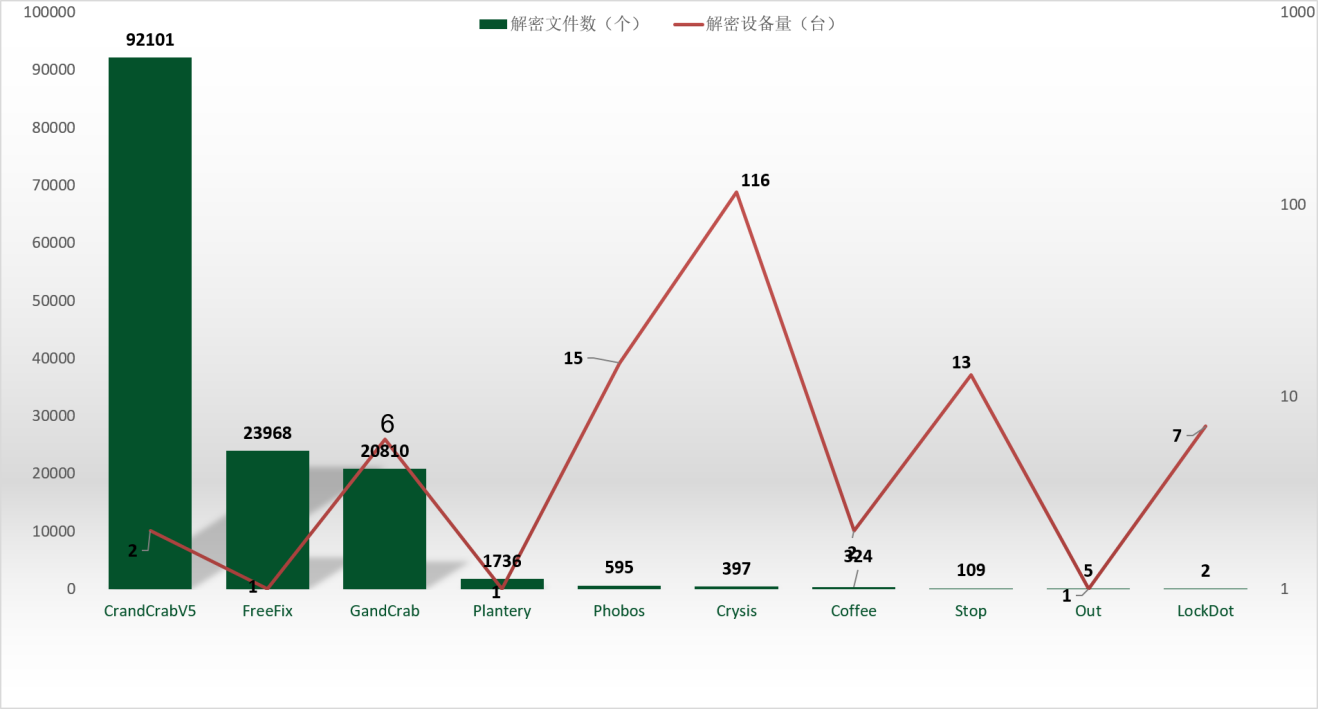 从解密大师本月解密数据看,解密量最大的是CrandCrabV5其次是FreeFix。使用解密大师解密文件的用户数量最高的是被Crysis家族加密的设备。