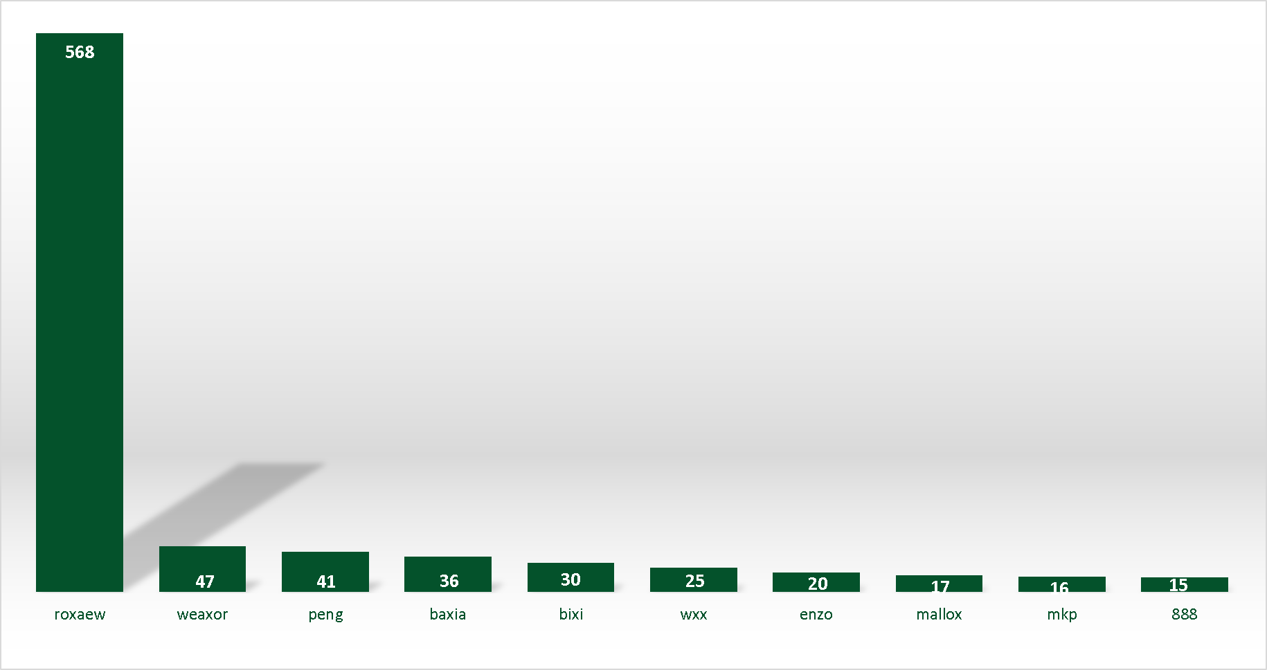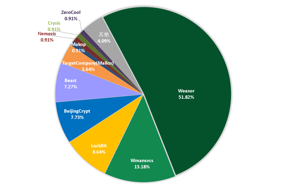 针对本月勒索软件受害者设备所中病毒家族进行统计:Weaxor家族占比51.82%居首位,第二的是Wmansvcs占比13.18%,LockBit家族以8.64%位居第三。